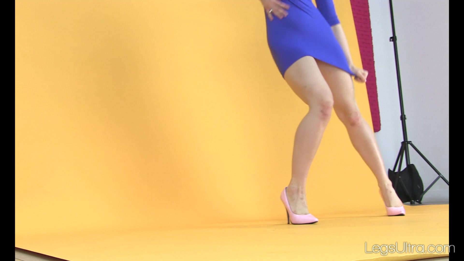 Juliette shows off struts her luscious long limbs in a tight blue dress and pink heels. She dances and poses for the camera, extending out her limbs and flaunting her natural beauty. She sits on a stool and crosses her legs back and forth. Then she lays on the rug and kicks her heels and stretches out her porcelain gams.