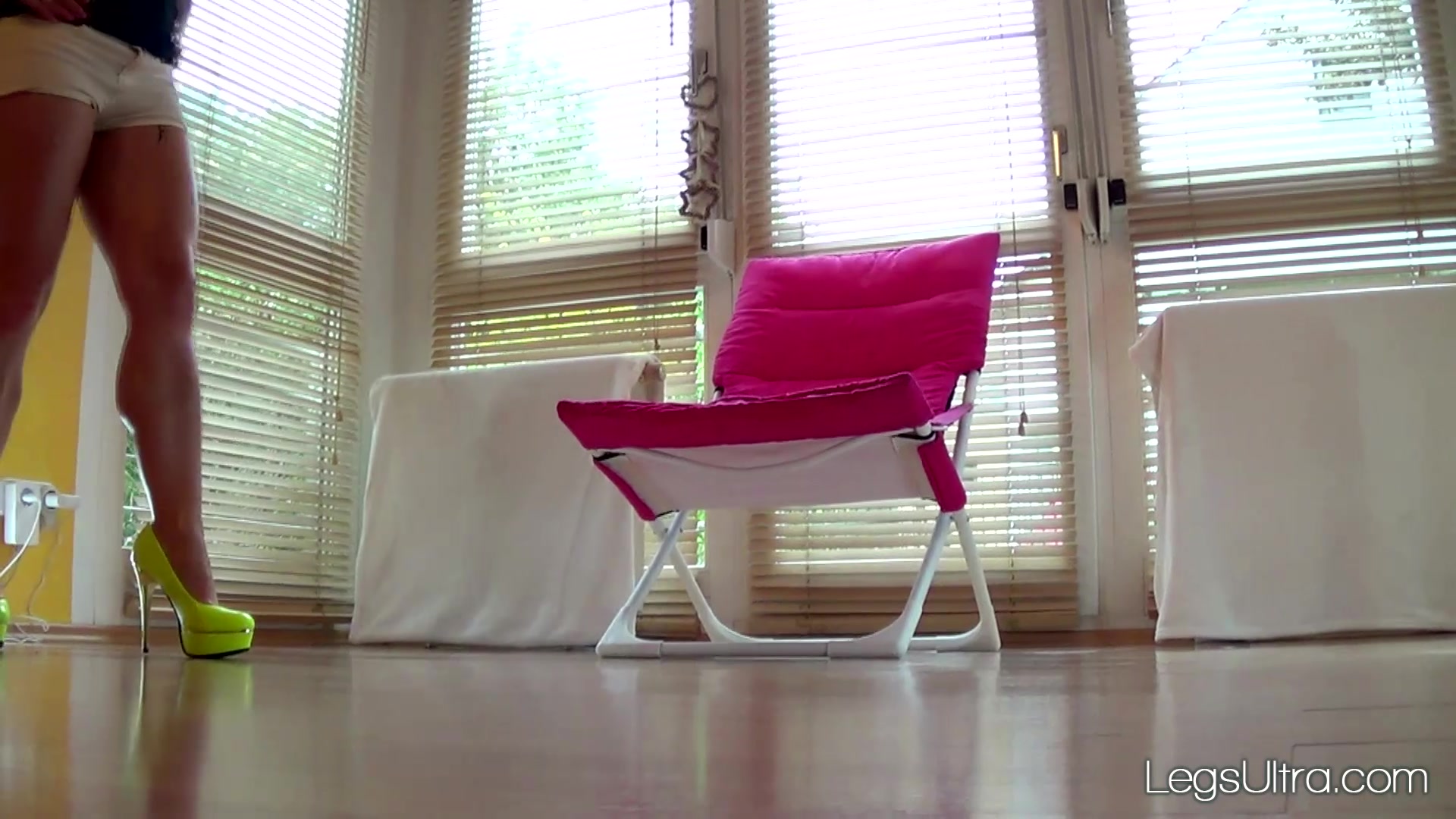 Alena shows off her incredibly fit and sculpted legs in fluorescent yellow heels. Her legs are slick and oily as she poses them for the camera. The lighting captures all the different curves and definition in her super muscular gams as she sits, stands, paces, and stretches her beautiful stems.