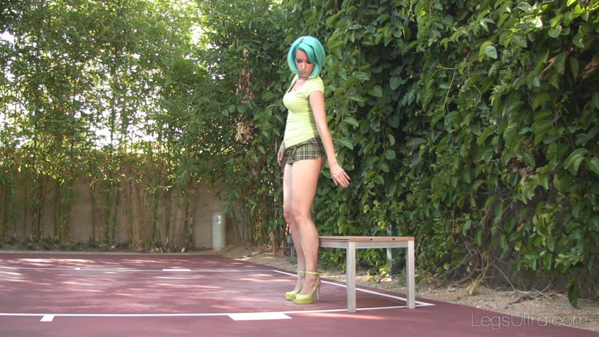 Danni is outside in her green plaid skirt that extra short and lime green heels. She starts standing up and rotating around so you can see her extra long legs and round butt. Then she takes a seat on the bench where she flexes her calves and carresses them. She crosses her legs slowly and repeatedly and kicks them out showing off her flexibility and strength