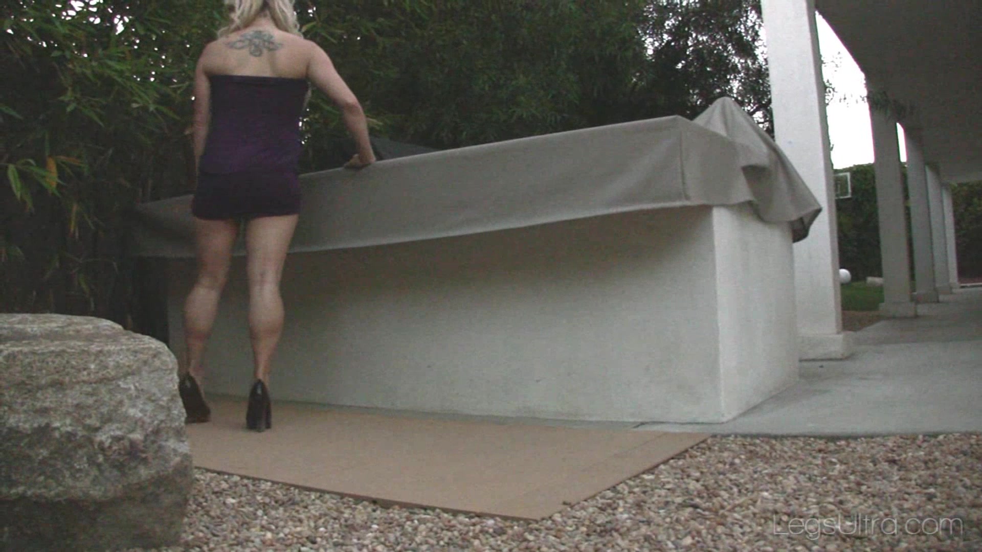 Annie Mae is looking ever so lovely outside in her purple dress and brown heels. She sits down and crosses her legs, juts them out, and presses her calves against the rock to make them even bigger! She bends over to show off her amazing back side and walks around while flexing her muscular stems.
